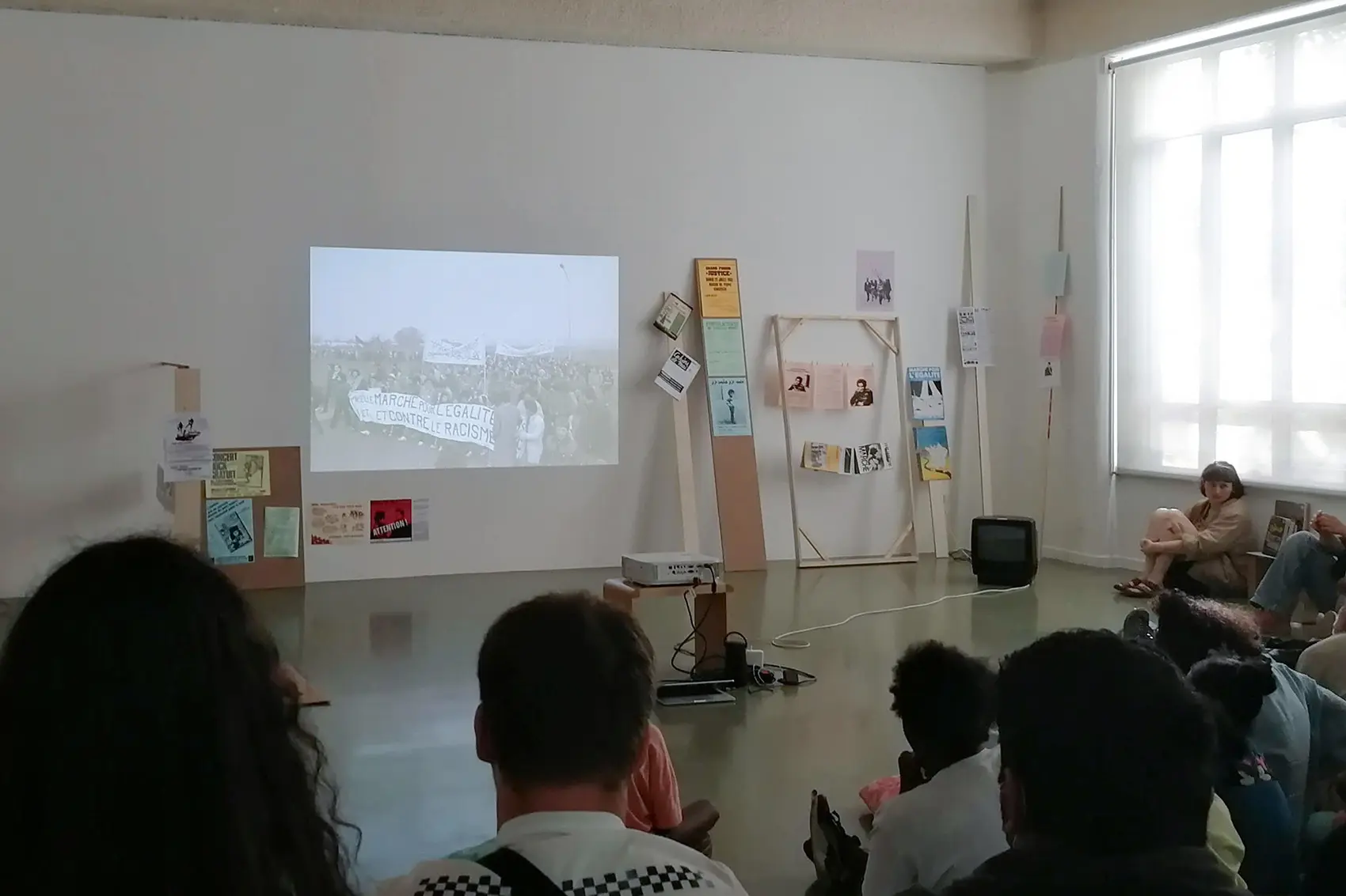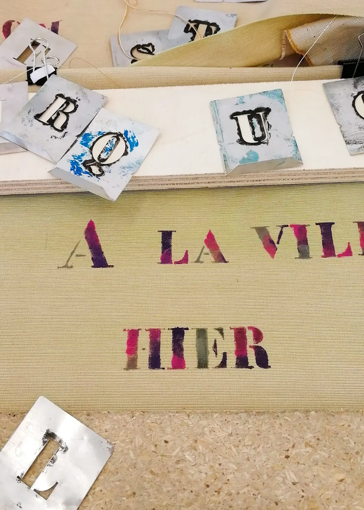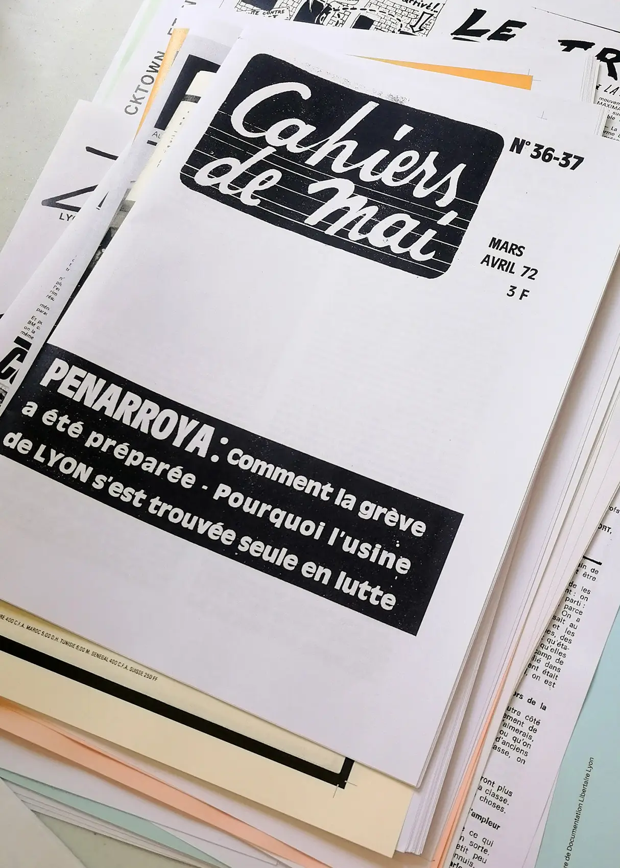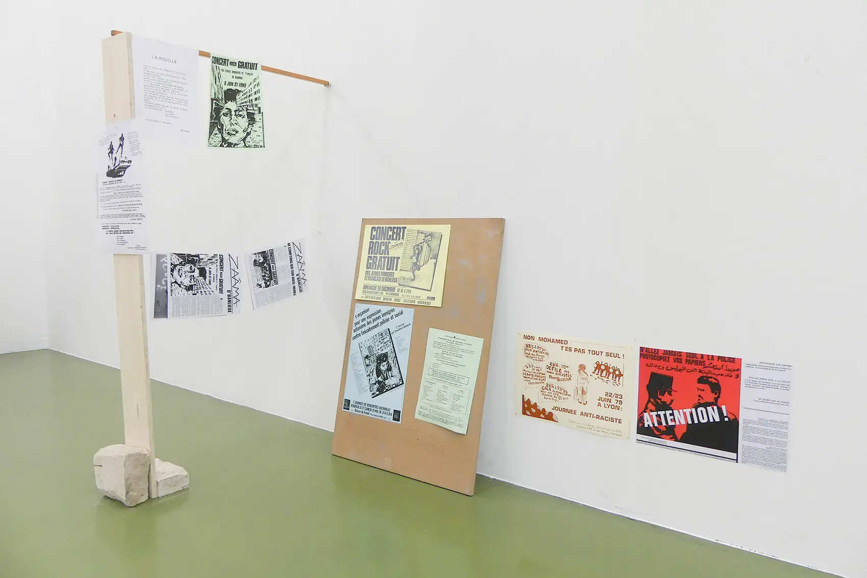 Scénographie et création de fac-similés à partir d'archives d'acteur·ices locaux·les militant contre le racisme et pour la défense des droits humains, pour le projet « Vénissieux, terre de luttes » [1]. Série d'ateliers autour des techniques graphiques et de l'artisanat : Ateliers d'impression citoyens [2], construction d'une presse typographique à partir de matériaux de réemploi [3], teinture végétale avec les jeunes de la Maison de l'Enfance [4], écriture du manifeste de la Résidence [5]. Avec Alicia Arco, Julia Krisch et No Touly. Vénissieux, 2024.