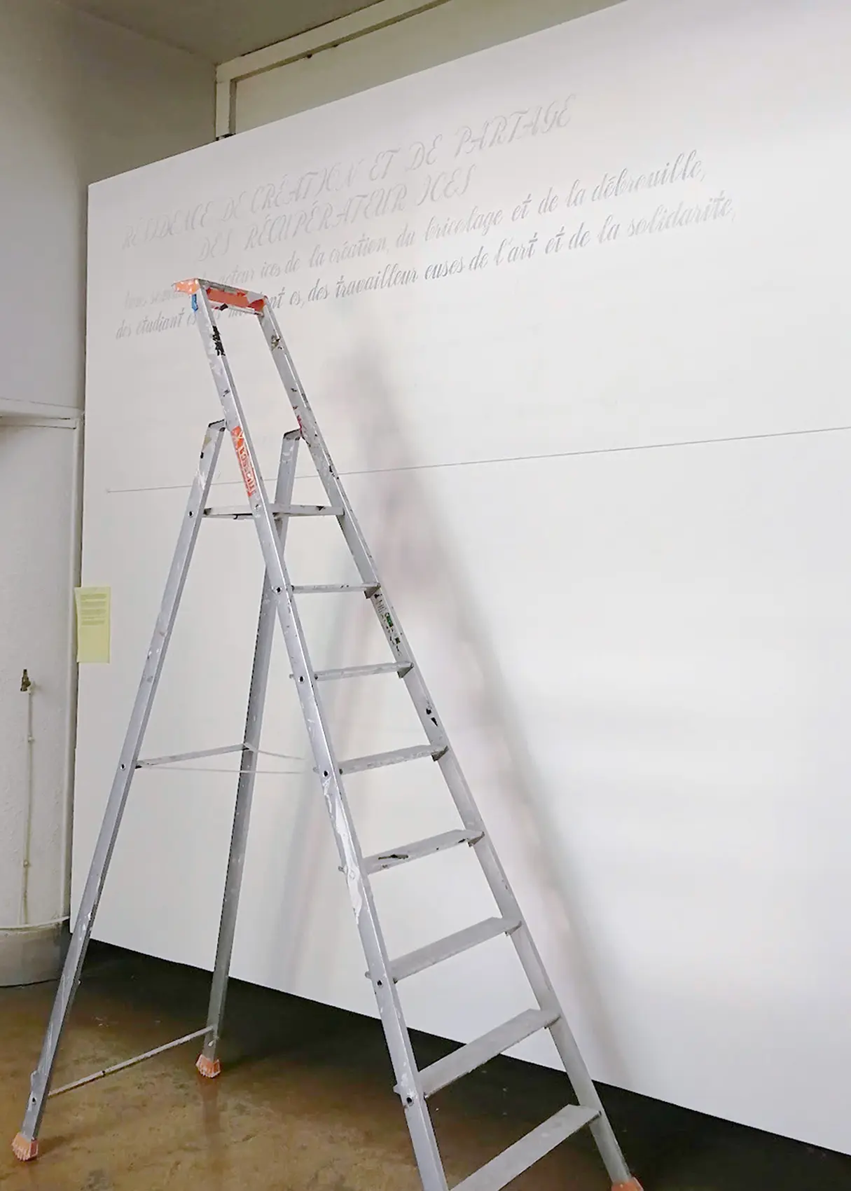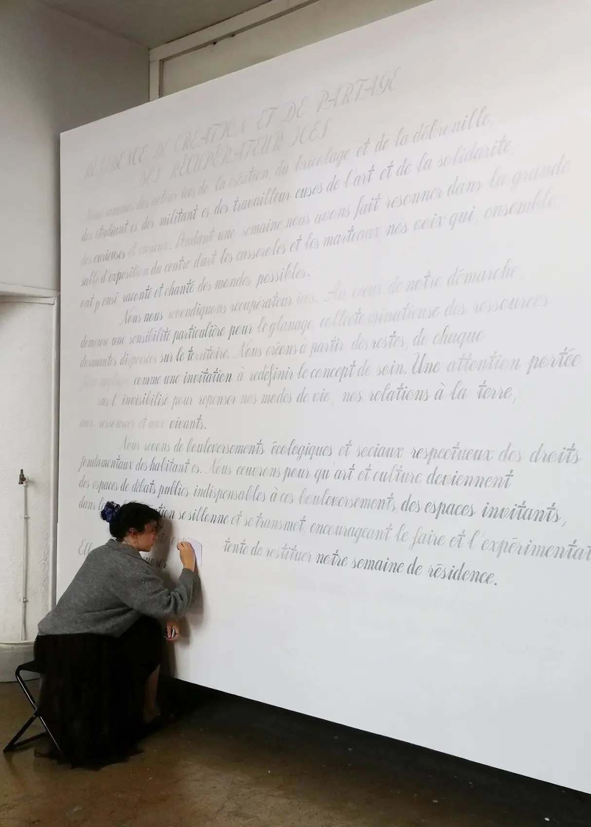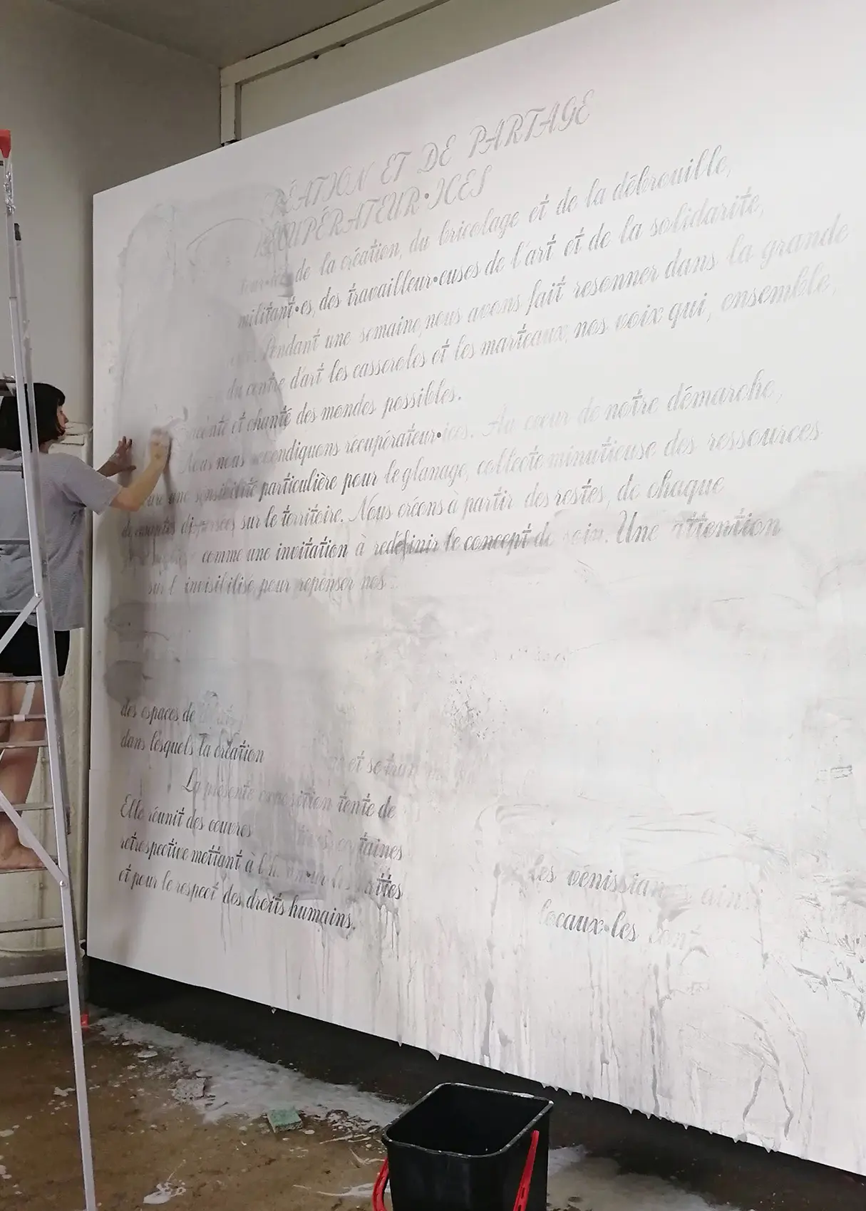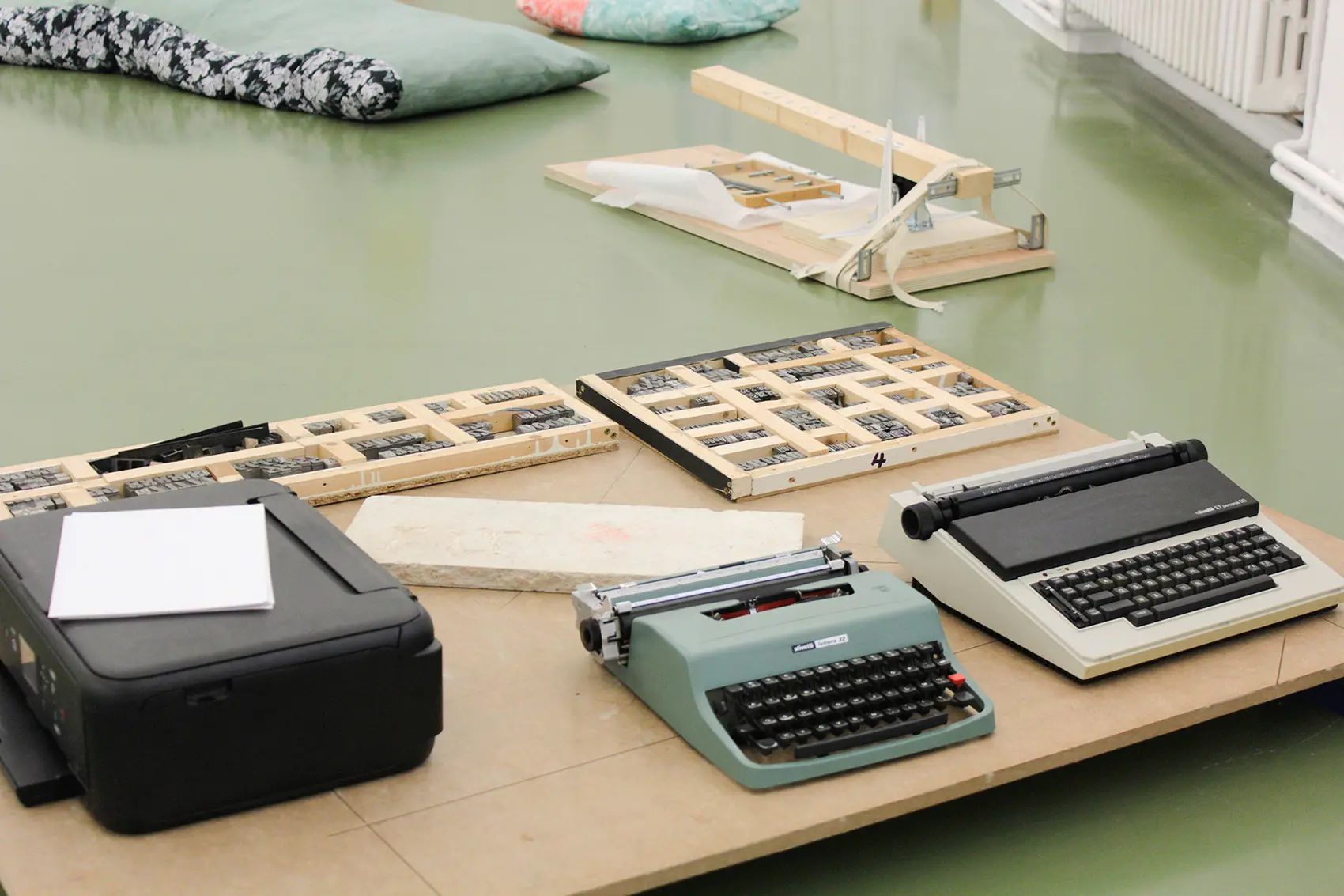 Scénographie et création de fac-similés à partir d'archives d'acteur·ices locaux·les militant contre le racisme et pour la défense des droits humains, pour le projet « Vénissieux, terre de luttes » [1]. Série d'ateliers autour des techniques graphiques et de l'artisanat : Ateliers d'impression citoyens [2], construction d'une presse typographique à partir de matériaux de réemploi [3], teinture végétale avec les jeunes de la Maison de l'Enfance [4], écriture du manifeste de la Résidence [5]. Avec Alicia Arco, Julia Krisch et No Touly. Vénissieux, 2024.